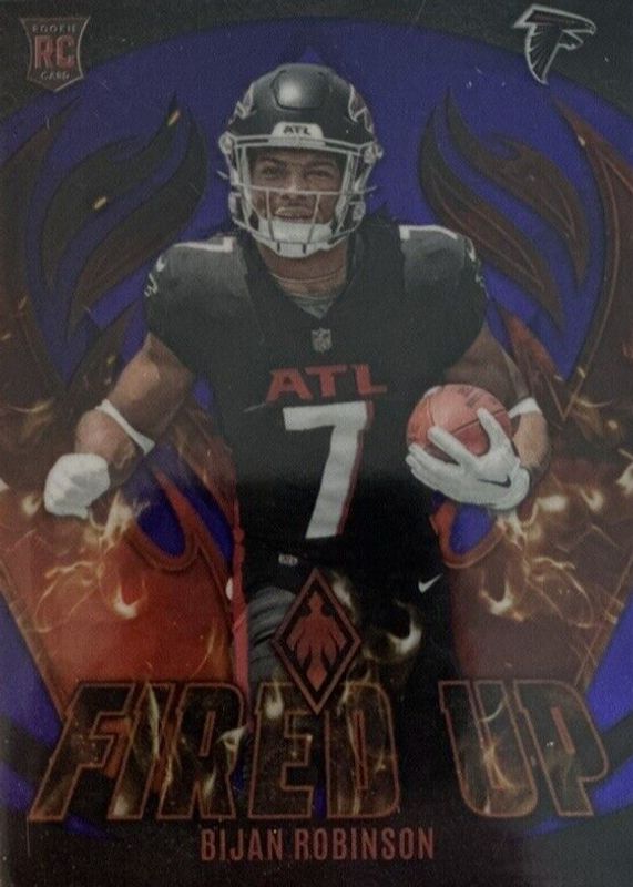 The Bijan Robinson 2023 Phoenix #FU-8 Fired Up - Purple /99 Rookie card in Raw condition has not changed in price in the last 30 days and was last sold for $11.70 .