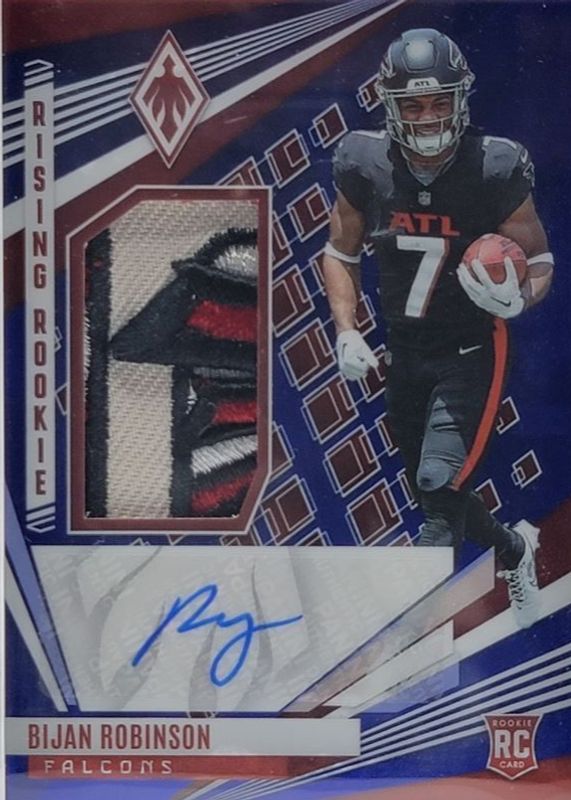 The Bijan Robinson 2023 Phoenix #RMS-BRO Rising Rookie Material Signatures - Hat /10 card in Raw condition has not changed in price in the last 30 days and was last sold for $180.00 .