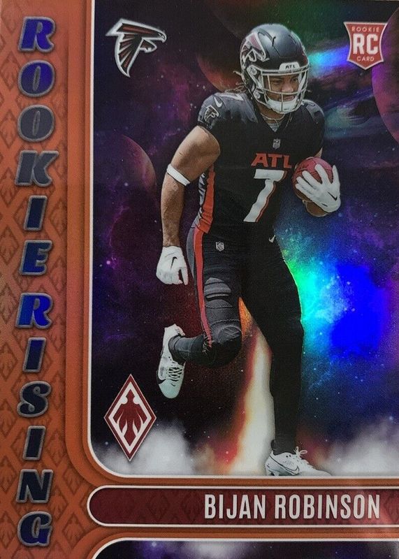 The Bijan Robinson 2023 Phoenix #RIS-6 Rookie Rising - Orange /99 card in Raw condition has not changed in price in the last 30 days and was last sold for $8.50 .