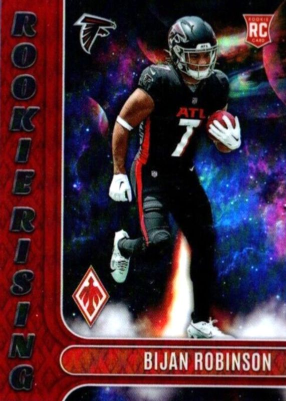 The Bijan Robinson 2023 Phoenix #RIS-6 Rookie Rising - Red /199 card in Raw condition has not changed in price in the last 30 days and was last sold for $3.99 .