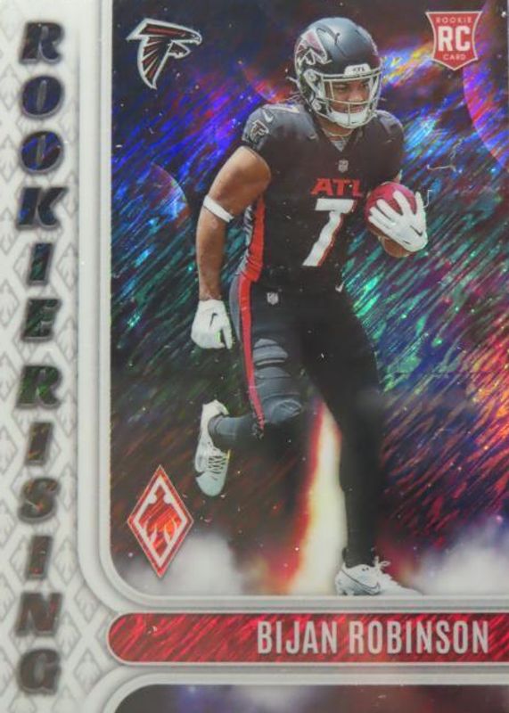 The Bijan Robinson 2023 Phoenix #RIS-6 Rookie Rising - White Shimmer /(SSP) card in Raw condition has not changed in price in the last 30 days and was last sold for $43.00 .