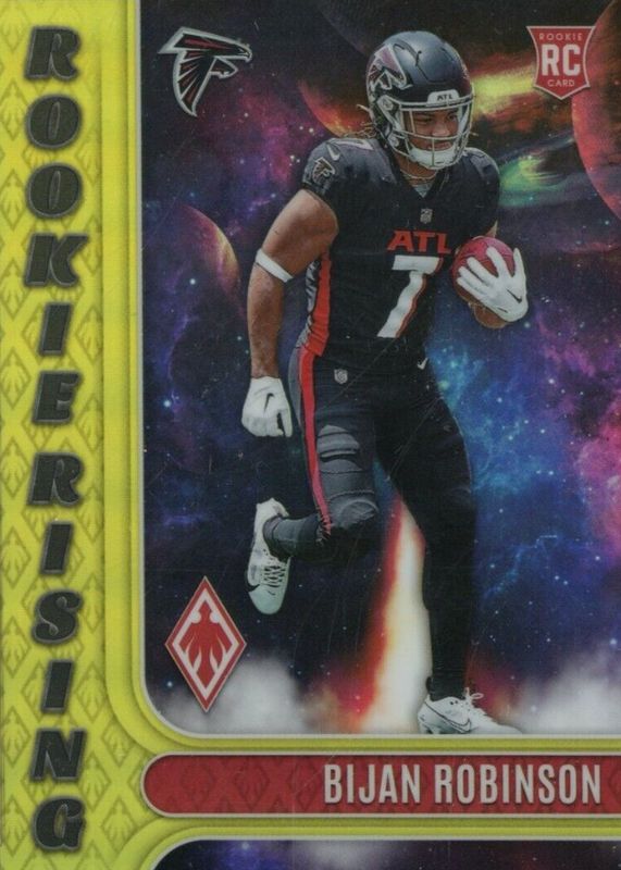 The Bijan Robinson 2023 Phoenix #RIS-6 Rookie Rising - Yellow /75 card in Raw condition has not changed in price in the last 30 days and was last sold for $28.00 .