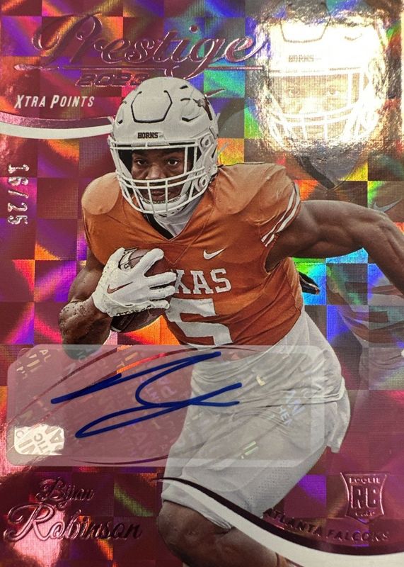 The Bijan Robinson 2023 Prestige #304 Xtra Points Signatures - Pink /25 Rookie card in Raw condition has not changed in price in the last 30 days and was last sold for $59.99 .