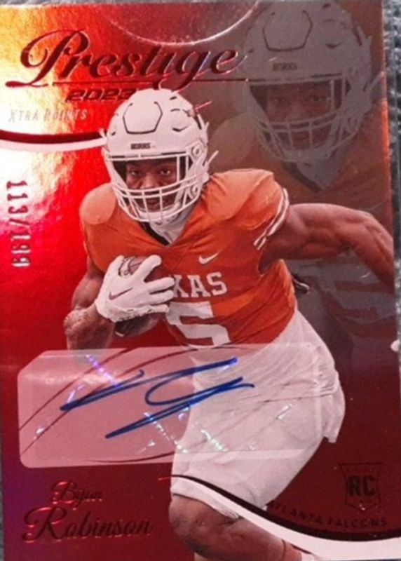 The Bijan Robinson 2023 Prestige #304 Xtra Points Signatures - Red /199 Rookie card in Raw condition has not changed in price in the last 30 days and was last sold for $71.25 .