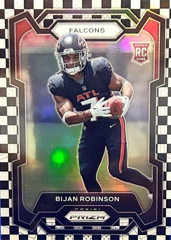 The Bijan Robinson 2023 Prizm #305 Black & White Checker /(SSP) Rookie card in Raw condition has not changed in price in the last 30 days and was last sold for $55.78 .