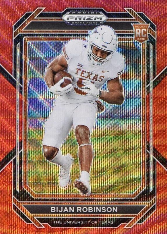 The Bijan Robinson 2023 Prizm Draft Picks #115 Ruby Wave Rookie card in Raw condition has not changed in price in the last 30 days and was last sold for $2.99 .