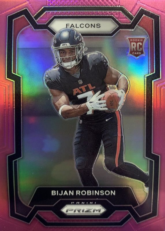 The Bijan Robinson 2023 Prizm #305 Pink Rookie card in Raw condition has moved down -$10.49 (-52.5%) in the last 30 days and was last sold for $9.50 .