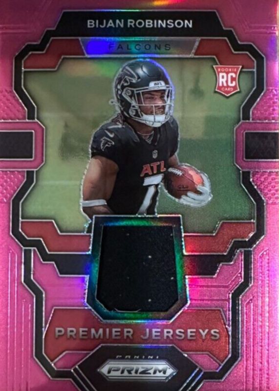 The Bijan Robinson 2023 Prizm #PJ-BR Premier Jerseys - Pink Rookie card in Raw condition has moved down -$3.38 (-55.1%) in the last 30 days and was last sold for $2.75 .