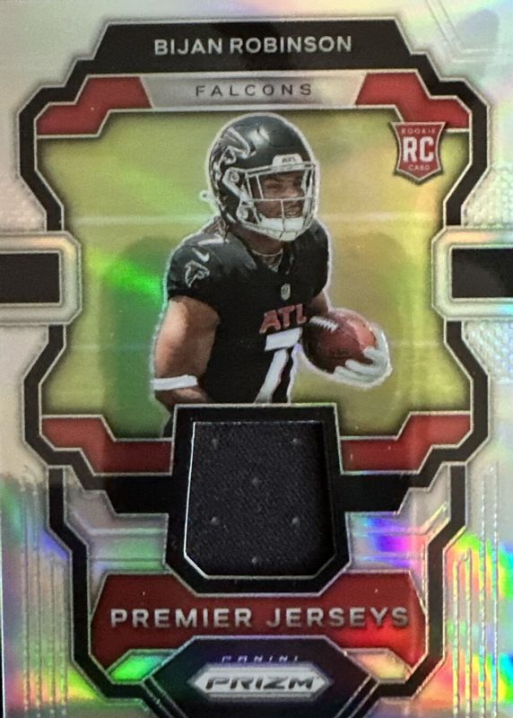 The Bijan Robinson 2023 Prizm #PJ-BR Premier Jerseys Rookie card in Raw condition has moved up $6.13 (+305%) in the last 30 days and was last sold for $8.14 .