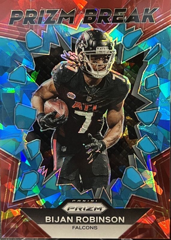 The Bijan Robinson 2023 Prizm #PB-8 Prizm Break - Blue Ice /99 Rookie card in Raw condition has not changed in price in the last 30 days and was last sold for $46.00 .
