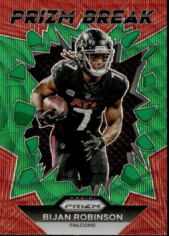 The Bijan Robinson 2023 Prizm #PB-8 Prizm Break - Green Wave Rookie card in Raw condition has moved down -$0.16 (-8.9%) in the last 30 days and was last sold for $1.59 .