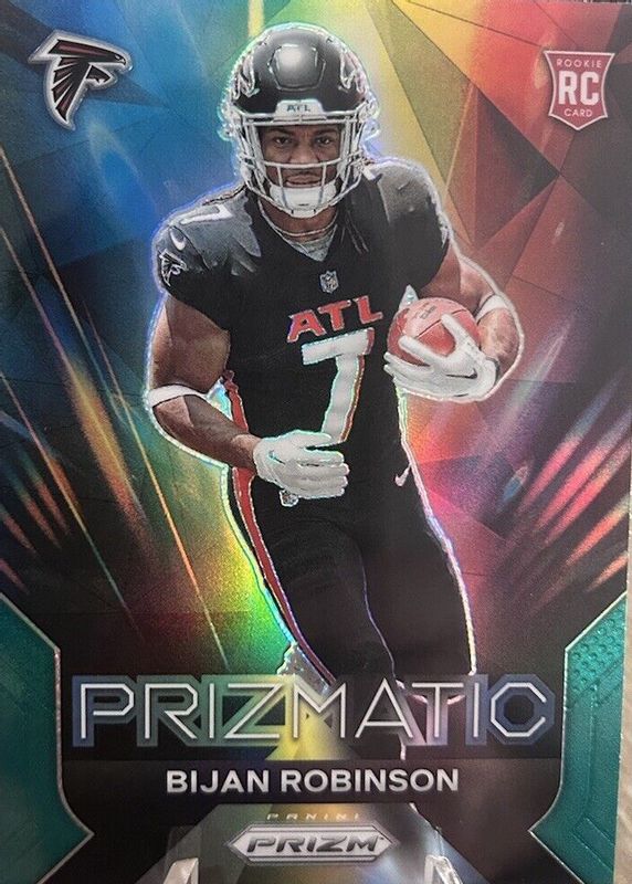 The Bijan Robinson 2023 Prizm #19 Prizmatic - Green Rookie card in Raw condition has moved up $4.16 (+226%) in the last 30 days and was last sold for $6.00 .