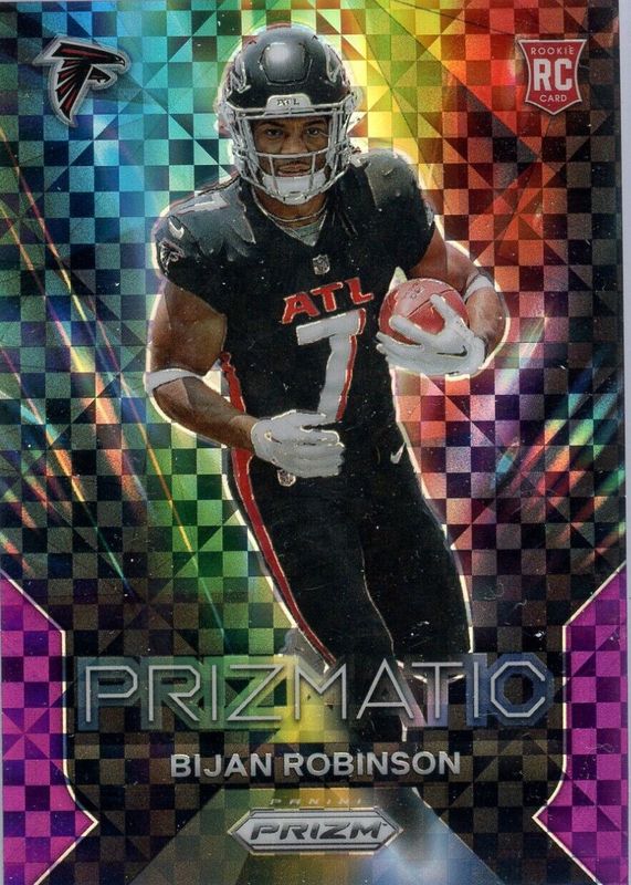 The Bijan Robinson 2023 Prizm #19 Prizmatic - Purple Power /49 Rookie card in Raw condition has not changed in price in the last 30 days and was last sold for $38.00 .