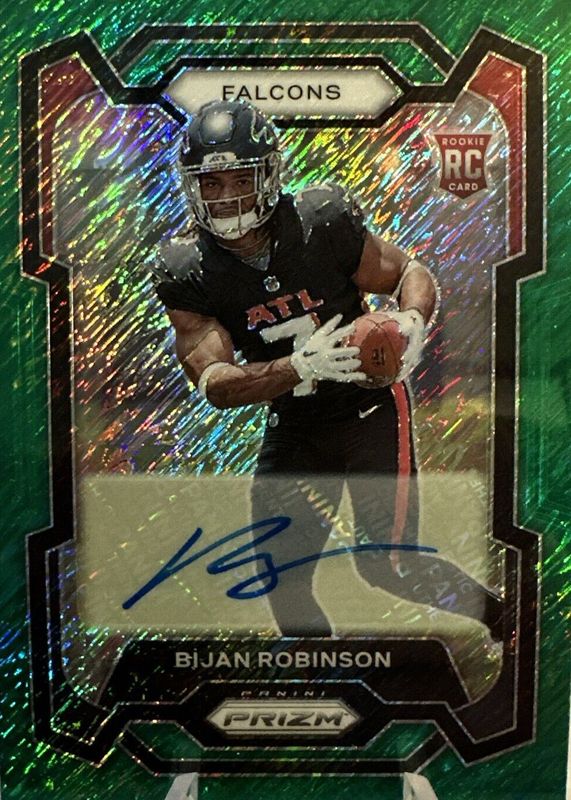 The Bijan Robinson 2023 Prizm #305 Rookie Autographs - Green Shimmer /5 card in Raw condition has not changed in price in the last 30 days and was last sold for $1,000.00 .