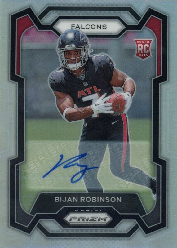 The Bijan Robinson 2023 Prizm #305 Rookie Autographs - Silver card in Raw condition has moved up $36.02 (+45.6%) in the last 30 days and was last sold for $115.00 .