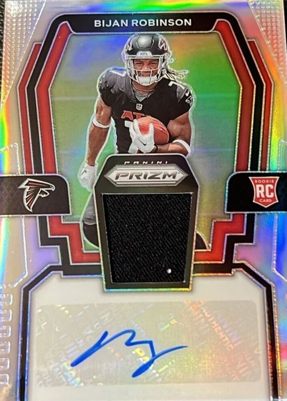 The Bijan Robinson 2023 Prizm #RPA-BR Rookie Patch Auto - Silver /99 card in Raw condition has not changed in price in the last 30 days and was last sold for $83.00 .
