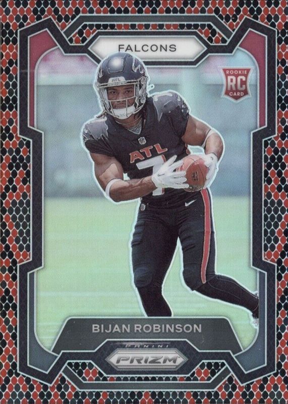 The Bijan Robinson 2023 Prizm #305 Snakeskin /(SSP) Rookie card in Raw condition has not changed in price in the last 30 days and was last sold for $249.99 .
