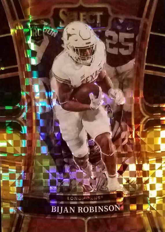 This card is 1 of 96 Bijan Robinson's card variations in the 2023 Select Draft Picks set being tracked by Sports Card Investor, including Concourse, Field Level, Concourse Blue, Concourse Gold Lazer, and Concourse Green Lazer.