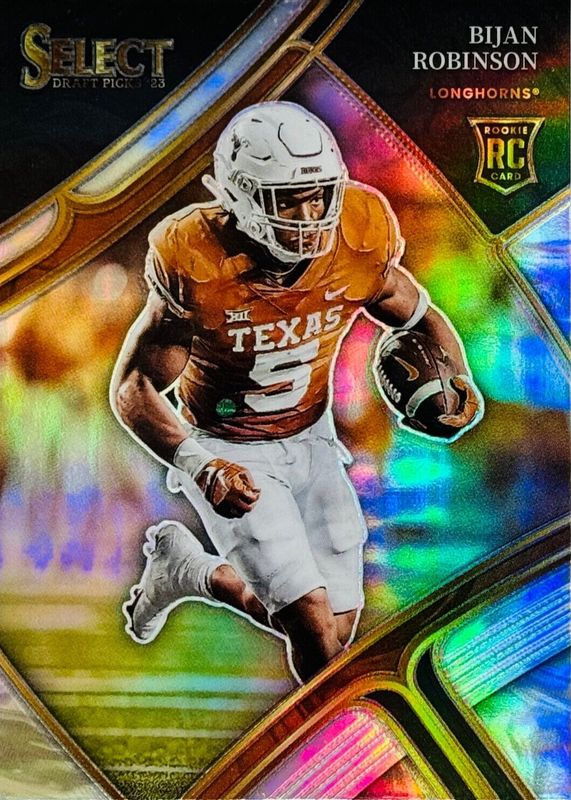 This card is 1 of 96 Bijan Robinson's card variations in the 2023 Select Draft Picks set being tracked by Sports Card Investor, including Concourse, Field Level, Concourse Blue, Concourse Gold Lazer, and Concourse Green Lazer.