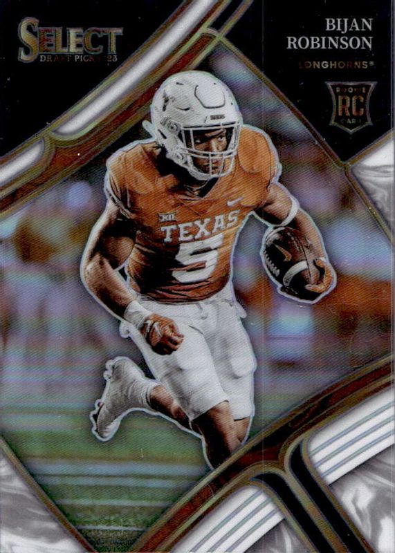 This card is 1 of 96 Bijan Robinson's card variations in the 2023 Select Draft Picks set being tracked by Sports Card Investor, including Concourse, Field Level, Concourse Blue, Concourse Gold Lazer, and Concourse Green Lazer.