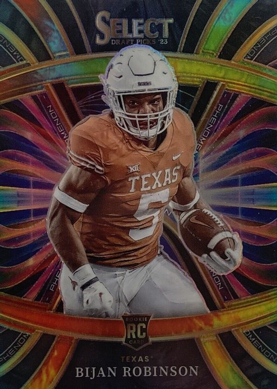 The Bijan Robinson 2023 Select Draft Picks #PH-BR Phenomenon - Tie-Dye /25 Rookie card in Raw condition has not changed in price in the last 30 days and was last sold for $45.00 .