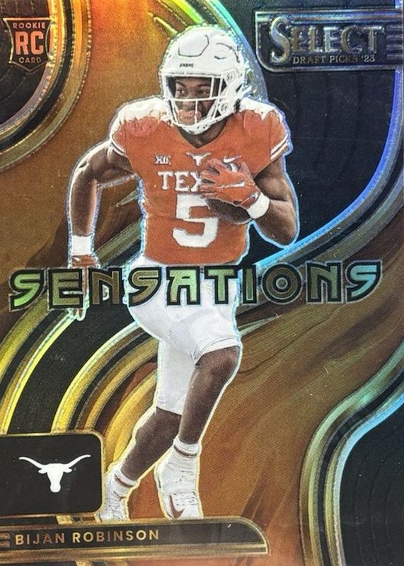 The Bijan Robinson 2023 Select Draft Picks #SEN-BR Sensations - Black /1 Rookie card in Raw condition has not changed in price in the last 30 days and was last sold for $375.00 .