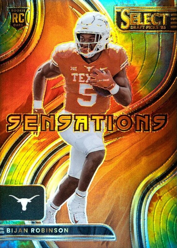 The Bijan Robinson 2023 Select Draft Picks #SEN-BR Sensations - Tie-Dye /25 Rookie card in Raw condition has not changed in price in the last 30 days and was last sold for $40.00 .