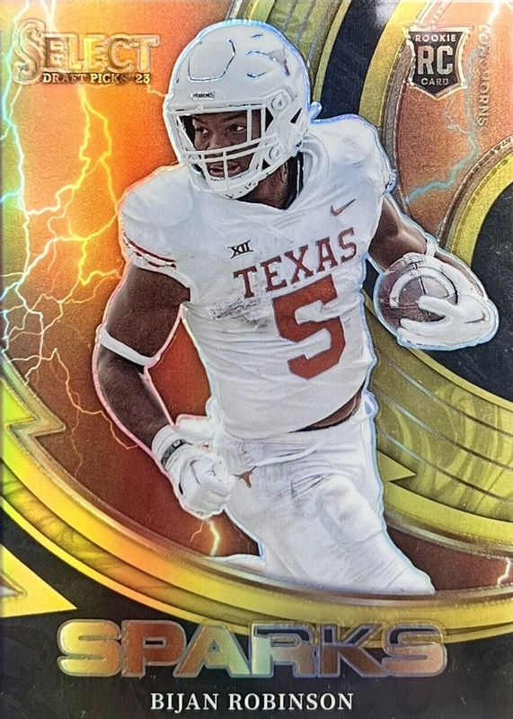 The Bijan Robinson 2023 Select Draft Picks #SPR-BR Sparks - Gold /10 Rookie card in Raw condition has not changed in price in the last 30 days and was last sold for $39.00 .