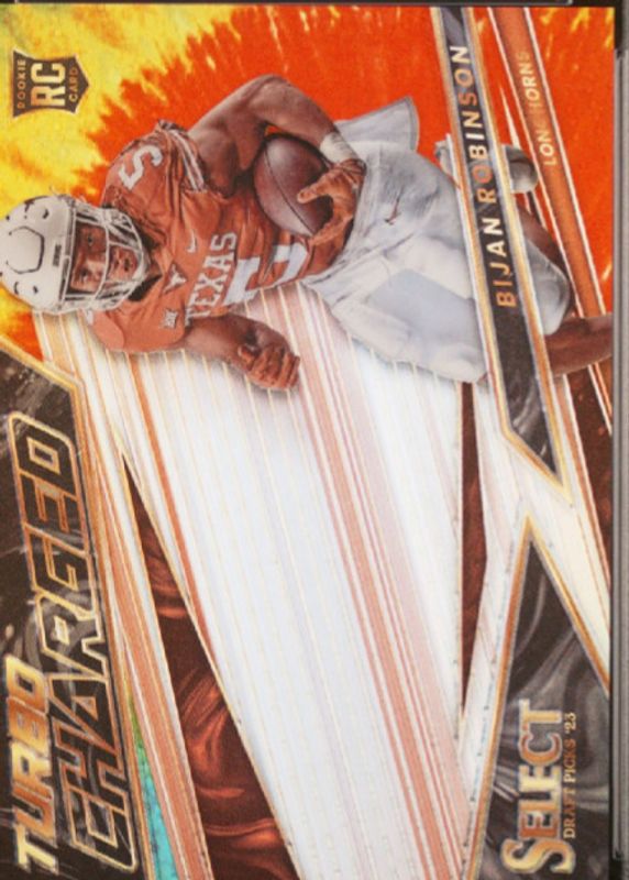The Bijan Robinson 2023 Select Draft Picks #TC-BR Turbocharged - Tie-Dye /25 Rookie card in Raw condition has not changed in price in the last 30 days and was last sold for $15.00 .