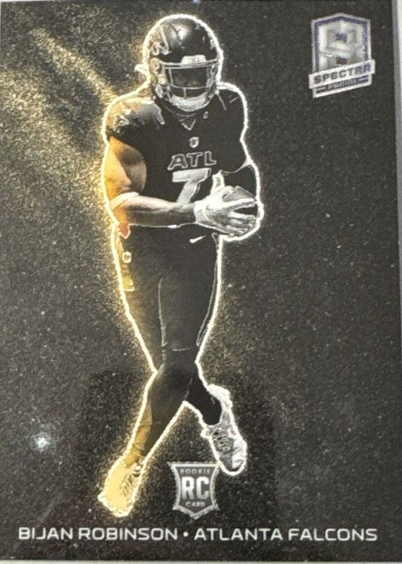 The Bijan Robinson 2023 Spectra #SE-BR Solar Eclipse /(SSP) Rookie card in Raw condition has not changed in price in the last 30 days and was last sold for $130.00 .