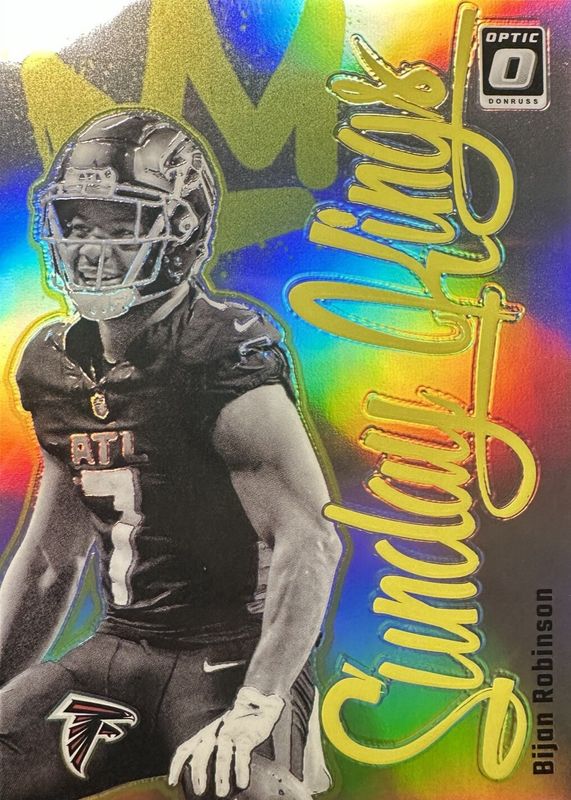 This card is 1 of 5 Bijan Robinson's card variations in the 2024 Optic set being tracked by Sports Card Investor, including Sunday Kings - Black Pandora /25, Sunday Kings - Gold /10, Sunday Kings - Gold Vinyl /1, and Sunday Kings - White Sparkle /1.