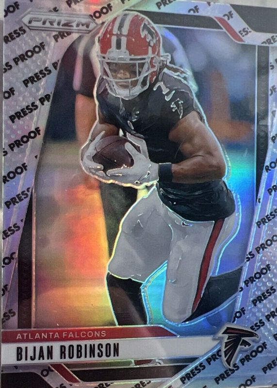 The Bijan Robinson 2024 Prizm #11 Press Proof /(SSP) card in Raw condition has not changed in price in the last 30 days and was last sold for $55.00 .