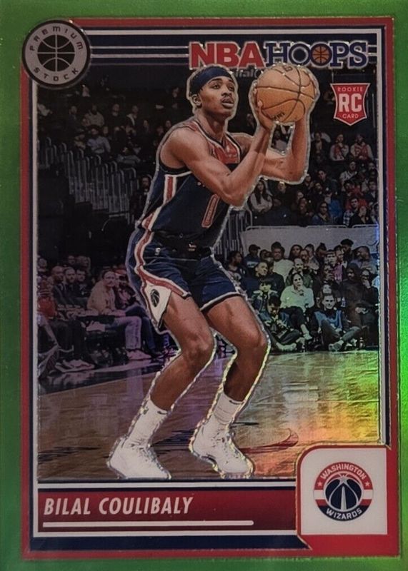 The Bilal Coulibaly 2023 Hoops Premium Stock #175 Neon Green /5 Rookie card in Raw condition has not changed in price in the last 30 days and was last sold for $135.00 .