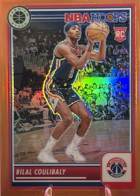 The Bilal Coulibaly 2023 Hoops Premium Stock #175 Orange /299 Rookie card in Raw condition has not changed in price in the last 30 days and was last sold for $9.95 .
