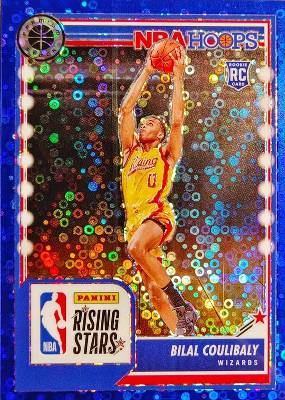 The Bilal Coulibaly 2023 Hoops Premium Stock #287 Rising Stars - Blue Disco /99 Rookie card in Raw condition has not changed in price in the last 30 days and was last sold for $4.25 .