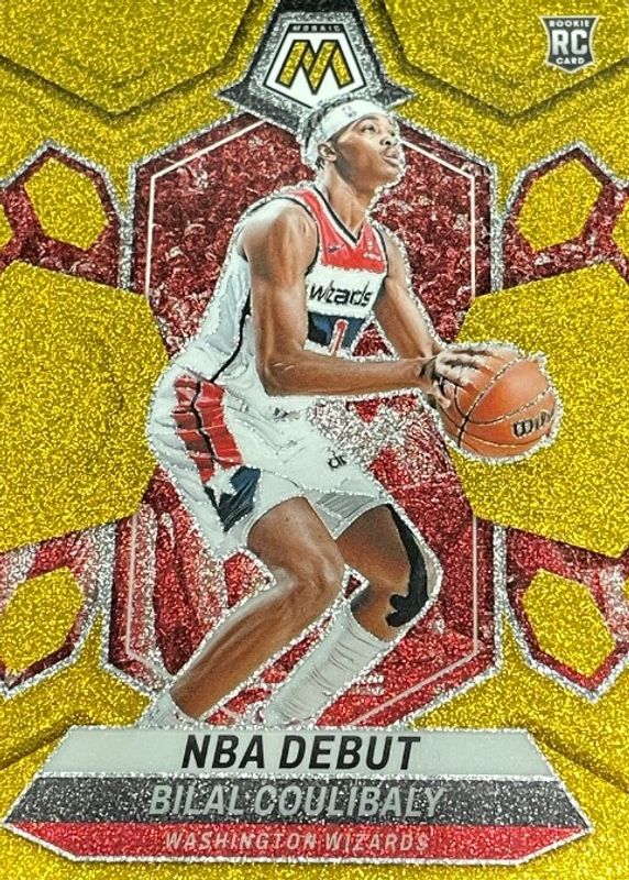 The Bilal Coulibaly 2023 Mosaic #268 NBA Debut - Gold Glitter /5 Rookie card in Raw condition has not changed in price in the last 30 days and was last sold for $93.99 .