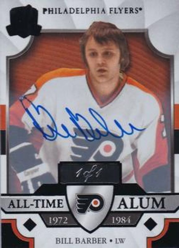 The Bill Barber 2019 Upper Deck The Cup #ATA-BB All Time Alumni - Black /1 card is 1 of 4 Bill Barber's card variations in the 2019 Upper Deck The Cup set being tracked by Sports Card Investor, including All Time Alumni - Gold /50, All Time Alumni - Red /5, and All Time Alumni /249.
