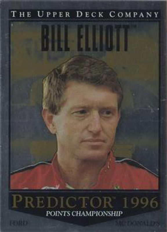 The Bill Elliott 1996 Upper Deck Road to the Cup #PP7a Predictors: Points Championship card is 1 of 10 Bill Elliott's card variations in the 1996 Upper Deck Road to the Cup set being tracked by Sports Card Investor, including #RC56a Base, #RC56b Base, #RC7a Base, #RC7b Base, and #GF9 Game Face.