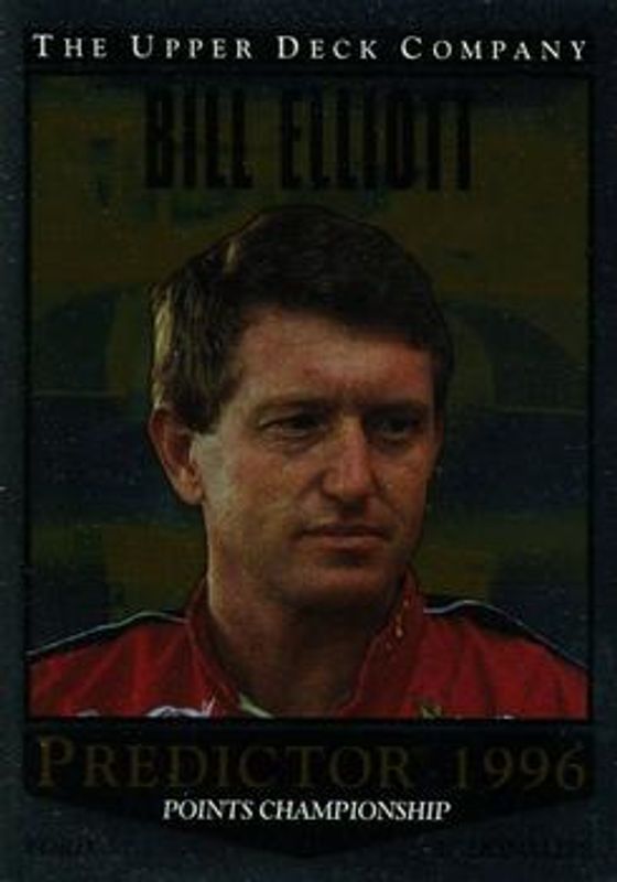 The Bill Elliott 1996 Upper Deck Road to the Cup #PP7b Predictors: Points Championship card is 1 of 10 Bill Elliott's card variations in the 1996 Upper Deck Road to the Cup set being tracked by Sports Card Investor, including #RC56a Base, #RC56b Base, #RC7a Base, #RC7b Base, and #GF9 Game Face.
