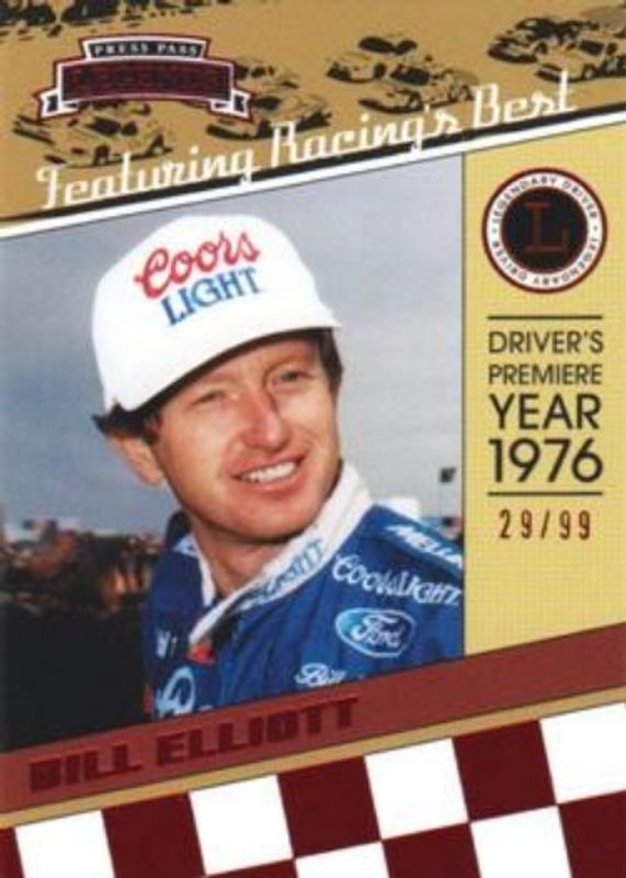 The Bill Elliott 2011 Press Pass Legends #11 Red /99 card is 1 of 41 Bill Elliott's card variations in the 2011 Press Pass Legends set being tracked by Sports Card Investor, including Base, Gold /250, Holofoil /25, Purple /25, and Press Plates Black /1.