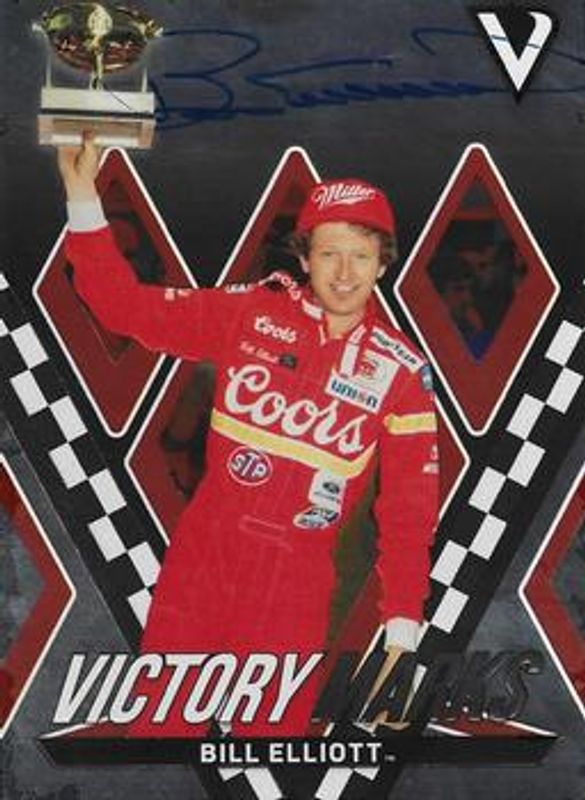 The Bill Elliott 2018 Victory Lane NASCAR #VM-BE Victory Marks /150 card is 1 of 59 Bill Elliott's card variations in the 2018 Victory Lane NASCAR set being tracked by Sports Card Investor, including #57 Base, #75 Base, #57 Silver, #75 Silver, and #57 Gold /99.