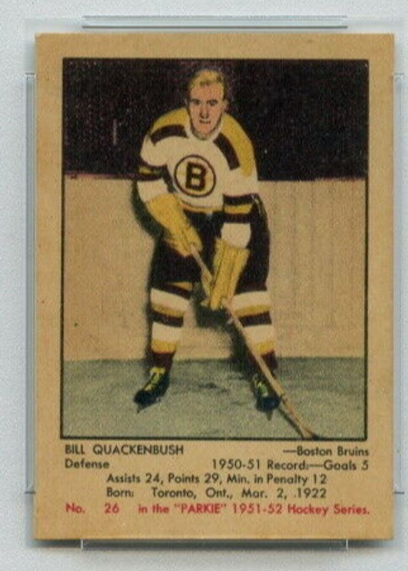 Bill Quackenbush's Hockey cards are available in at least 14 sets. Bill Quackenbush's biggest 7-day price movers are 1951 Parkhurst #26 Base, 1953 Parkhurst #100 Base, and 2002 Parkhurst #186 Parkie Reprints.