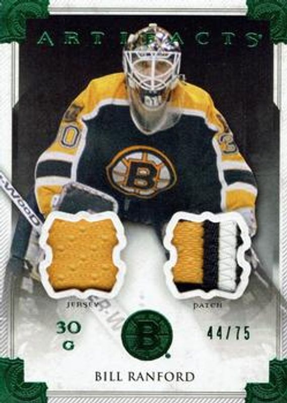The Bill Ranford 2013 Upper Deck Artifacts #102 Jersey Patch Emerald /75 card is 1 of 10 Bill Ranford's card variations in the 2013 Upper Deck Artifacts set being tracked by Sports Card Investor, including Base /899, Ruby /299, Emerald /99, Sapphire /85, and Spectrum /25.