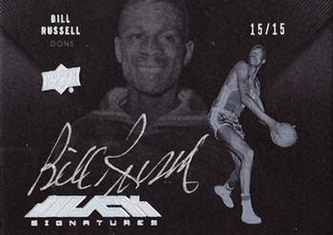 The Bill Russell 2012 Upper Deck Exquisite Collection #B-BR UD Black Autographs /15 card is 1 of 18 Bill Russell's card variations in the 2012 Upper Deck Exquisite Collection set being tracked by Sports Card Investor, including Base /99, Gold Masterpiece Autographs /1, Dimensions Autographs, Collegiate Seal Autographs /99, and Signatures Silver Spectrum /99.