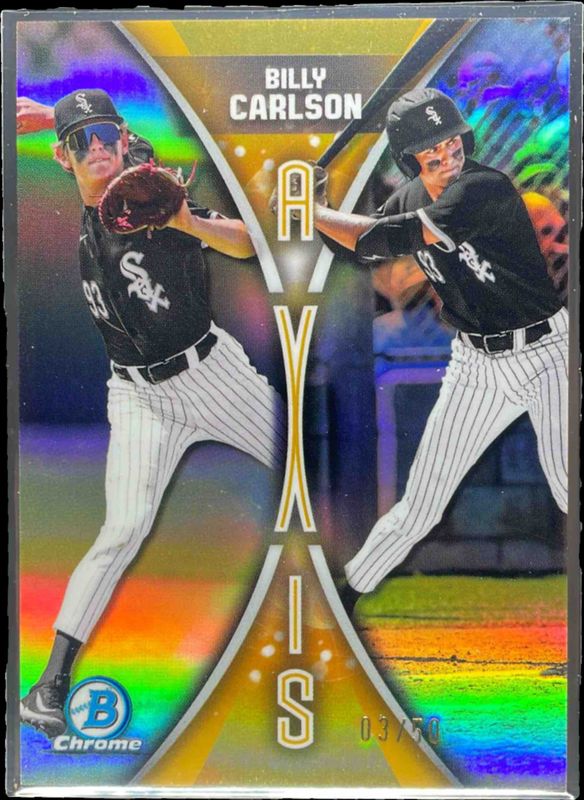 The Billy Carlson 2025 Bowman Draft #A-4 Axis - Gold Refractor /50 card is 1 of 145 Billy Carlson's card variations in the 2025 Bowman Draft set being tracked by Sports Card Investor, including Base, Base (1st), Chrome (1st), Chrome Image Variation, and Chrome - Lazer Refractor (1st).