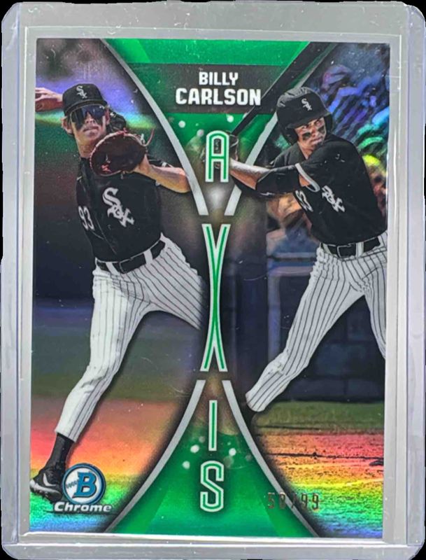 The Billy Carlson 2025 Bowman Draft #A-4 Axis - Green Refractor /99 card is 1 of 145 Billy Carlson's card variations in the 2025 Bowman Draft set being tracked by Sports Card Investor, including Base, Base (1st), Chrome (1st), Chrome Image Variation, and Chrome - Lazer Refractor (1st).