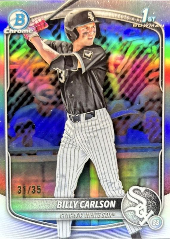 The Billy Carlson 2025 Bowman Draft #BDC-10 Chrome - Bowman Logofractor /35 (1st) card in Raw condition has not changed in price in the last 30 days and was last sold for $85.00 .