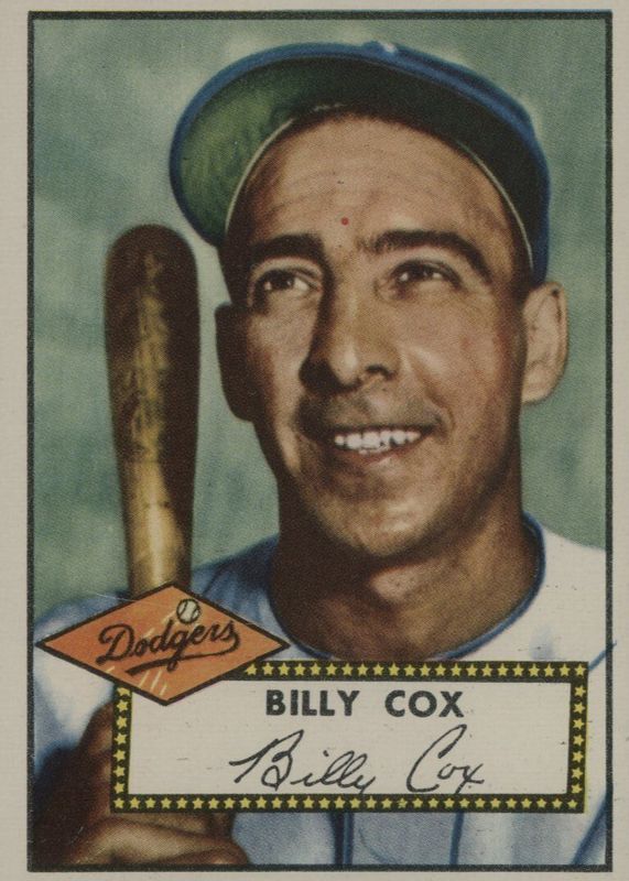 The Billy Cox 1952 Topps #232 Base card in PSA 6 condition has moved up $8.68 (+8.9%) in the last 30 days and was last sold for $106.68 .