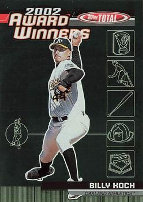 The Billy Koch 2003 Topps Total #AW25 Award Winners card is 1 of 3 Billy Koch's card variations in the 2003 Topps Total set being tracked by Sports Card Investor, including Base, and Silver.