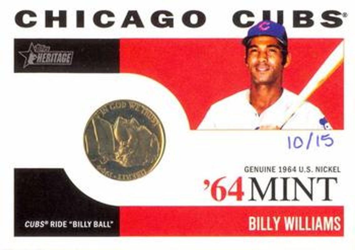 The Billy Williams 2013 Topps Heritage #64M-BW 1964 Mint - Nickel /15 card is 1 of 7 Billy Williams' card variations in the 2013 Topps Heritage set being tracked by Sports Card Investor, including 1964 Stamps Buyback, 1964 Tattoo Buyback, Baseball Flashback Relic Autographs /25, 1964 Mint - Dime /10, and 1964 Mint - Quarter /5.